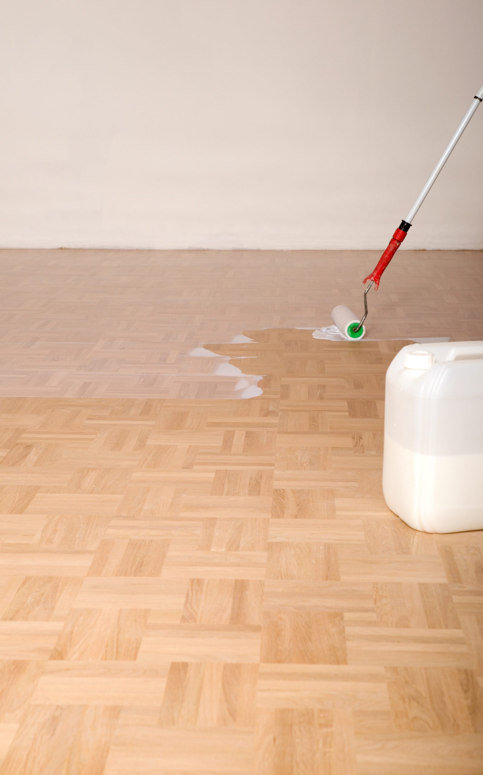 Bei einer Versiegelung mit Lack in matt oder seidenmatt bleibt die originale Holztönung erhalten und lässt sich nicht verändern. Das Holz wird dabei zunächst grundiert und nachfolgend zwei Lackschichten aufgetragen. Dadurch wird der Boden sehr robust gegenüber mechanischen Belastungen – verliert durch diese Schutzschicht allerdings von seiner Natürlichkeit und Haptik. Durch die komplette Versiegelung der Holzoberfläche kann kein Feuchtigkeitsaustausch mit der Raumluft stattfinden, was sich negativ auf das Raumklima auswirken kann. Dafür ist der Boden aber wiederum sehr pflegeleicht. Für hohe Ansprüche an die Belastbarkeit des Bodens können wir Ihnen eine Versiegelung mit einem 2-Komponenten-Lack (Turnhallenlack) anbieten. Bei Schäden an der Lackschicht z.B. durch punktuelle Überlastungen oder Kratzern könnte Feuchtigkeit in den Boden eindringen und Verfärbungen verursachen. Dann müsste der Boden ggf. erneut komplett abgeschliffen und versiegelt werden.